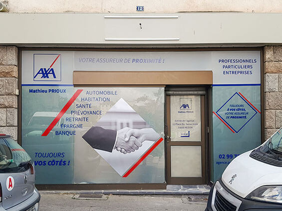 Pensez à l’adhésif ! Grâce à ce média, nous pouvons personnaliser vos vitrines comme nous l’avons fait chez AXA Assurances Mathieu Prioux à Redon !