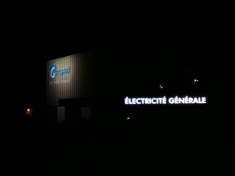 Création et pose d’une nouvelle enseigne lumineuse pour Gergaud industries à Redon, Ille-et-vilaine (35). Une enseigne divisée en deux parties. Un côté caisson évidé rétro éclairé et un côté lettres découpées avec éclairage spot lumineux